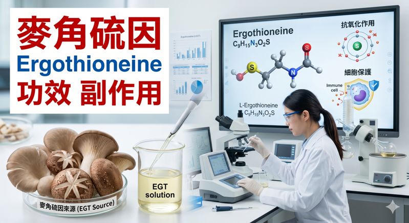 麥角硫因(L-Ergothioneine, 簡稱 EGT)是一種天然存在的含硫胺基酸,主要發現於特定菇蕈類與微菌中。人體無法自行合成,但演化出專屬的細胞膜轉運蛋白(OCTN1 / SLC22A4),能主動將 EGT 高效運輸並儲存於氧化壓力極大的器官中(如大腦、紅血球、骨髓、肝臟與眼底)。因其卓越的抗氧化、抗發炎與粒線體保護能力,且具備極高的生物安全性(獲美國 FDA GRAS 認證及歐盟 EFSA 新食品核准),近年被科學界廣泛譽為潛在的「長壽維生素」[1][2]。